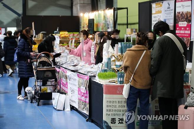 (서울=연합뉴스) 류효림 기자 = 14일 서울 강남구 대치동 세텍(SETEC) 전시장에서 열린 마이펫페어 2022에서 관람객들이 반려견과 함께 반려동물 용품과 제품들을 둘러보고 있다. 2022.1.14