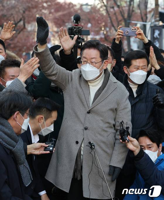 (인천=뉴스1) 국회사진취재단 = 이재명 더불어민주당 대선후보가 14일 오후 인천시 부평구 부평 문화거리를 방문, 시민들에게 인사하고 있다. 2022.1.14/뉴스1