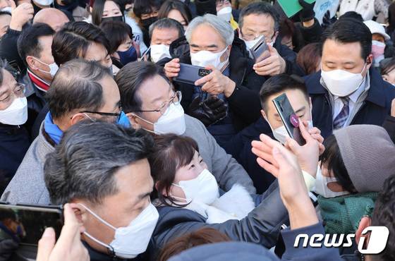 (인천=뉴스1) 국회사진취재단 = 이재명 더불어민주당 대선후보가 14일 오후 인천시 부평구 부평 문화거리를 방문, 시민들과 기념촬영을 하고 있다. 2022.1.14/뉴스1