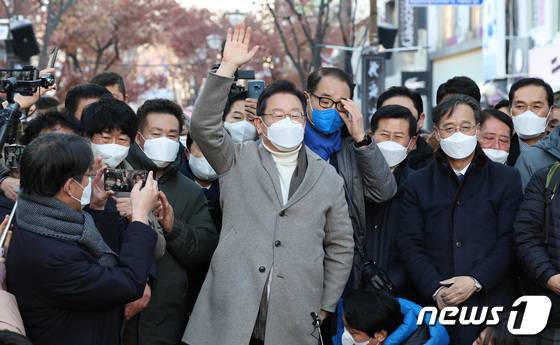 (인천=뉴스1) 국회사진취재단 = 이재명 더불어민주당 대선후보가 14일 오후 인천시 부평구 부평 문화거리를 방문, 시민들에게 인사하고 있다. 2022.1.14/뉴스1