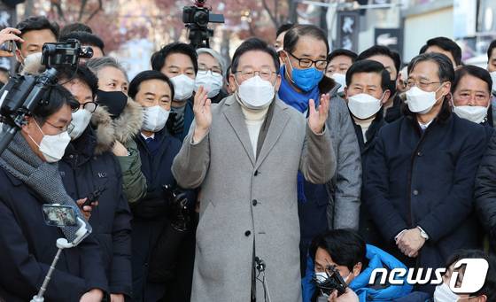 (인천=뉴스1) 국회사진취재단 = 이재명 더불어민주당 대선후보가 14일 오후 인천시 부평구 부평 문화거리를 방문, 즉석연설하고 있다. 2022.1.14/뉴스1