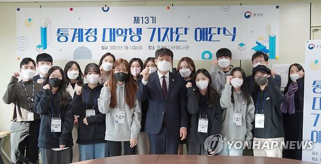 (서울=연합뉴스) 14일 서울 강남구 통계청 나라셈도서관에서 열린 '제13기 통계청 대학생 기자단 해단식'에서 류근관 통계청장과 기자단이 기념 촬영을 하고 있다. 2022.1.14 [통계청 제공. 재판매 및 DB 금지]