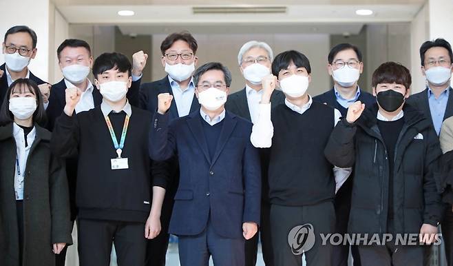 (아산=연합뉴스) 새로운물결 김동연 대선후보가 14일 삼성디스플레이 아산2캠퍼스 산업현장을 방문, 기념촬영을 하고 있다. 2022.1.14 [새로운물결 선대위 제공. 재판매 및 DB 금지]
