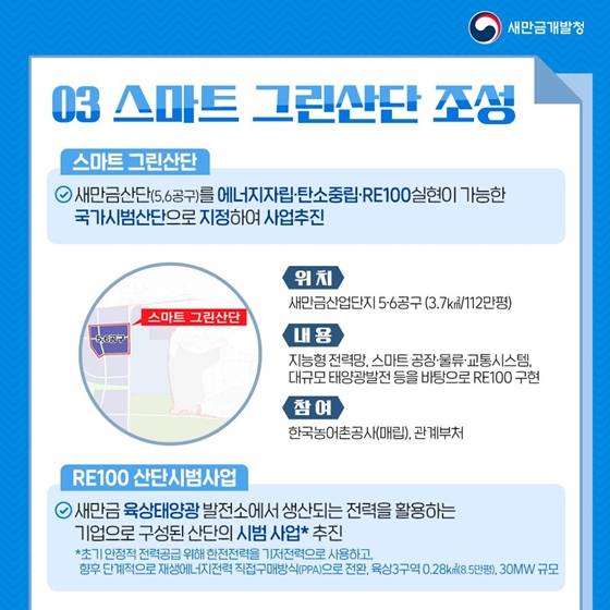 새만금산단(5·6공구)를 에너지자립·탄소중립·RE100 실현이 가능한 국가시범산단으로 지정하여 사업추진