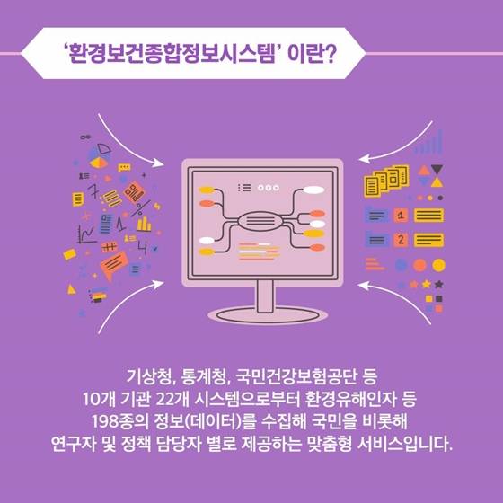 기상청, 통계청, 국민건강보험공단 등 10개 기관 22개 시스템으로부터 환경유해인자 등 198종의 정보(데이터)를 수집해 국민을 비롯해 연구자 및 정책 담당자별로 제공하는 맞춤형 서비스
