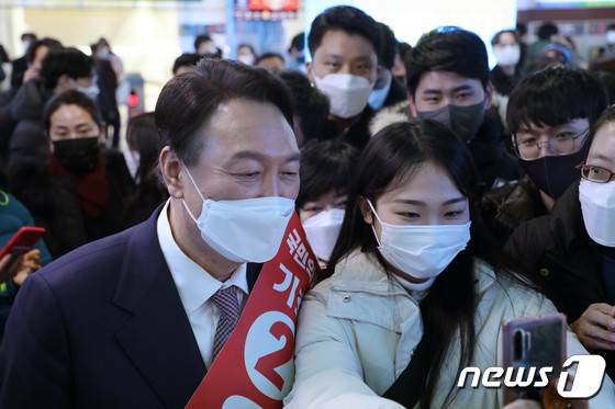 (부산=뉴스1) 노경민 기자 = 윤석열 국민의힘 대선 후보가 14일 오후 부산 도시철도 1, 2호선 서면역에서 시민들과 퇴근길 기념 촬영을 하고 있다.2022.1.14/뉴스1