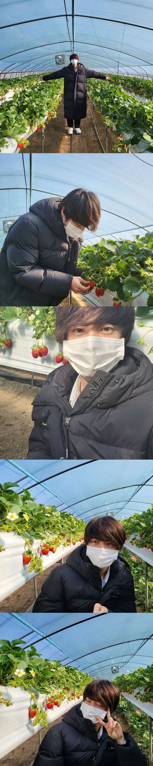 공개된 사진은 패딩을 입고 딸기밭에서 딸기를 따고 있는 진의 모습. 마스크로 다 가려지는 작은 얼굴을 한 진은 딸기밭에서 딸기를 따고 있다. 집중해서 딸기를 따고 있는 그의 모습에 보는 팬들의 이목이 집중됐다.