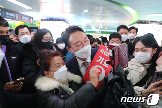 (부산=뉴스1) 노경민 기자 = 윤석열 국민의힘 대선 후보가 14일 오후 부산 서면역에서 시민들과 퇴근길 기념 촬영을 하고 있다.2022.1.14/뉴스1