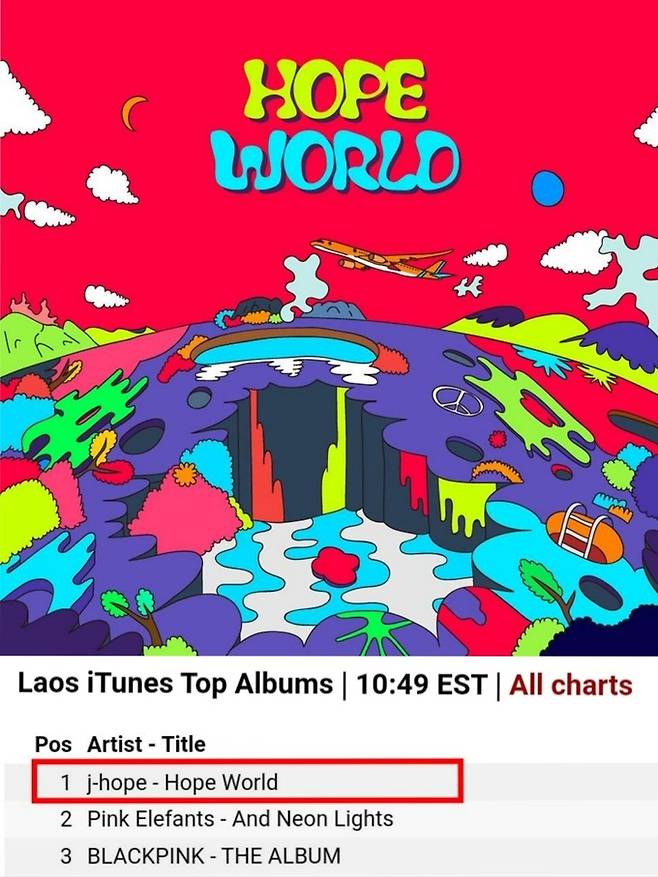 14일 아이튠즈에 따르면 제이홉의 솔로 믹스테이프(비정규 무료앨범) '홉 월드(Hope World)'가 라오스 앨범 차트 1위에 올랐다.