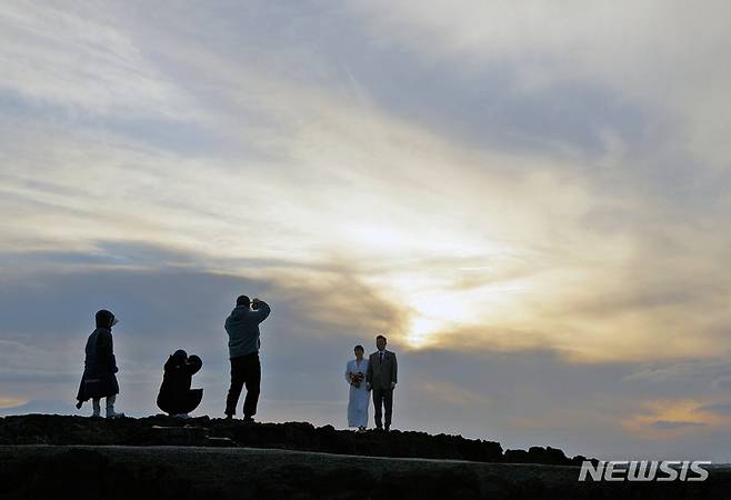 [제주=뉴시스] 이산책 기자 = 예비 신부 신랑이 14일 제주 김녕 인근 바닷가에서 저무는 해를 배경으로 웨딩 촬영을 하고 있다. 2022.01.14. photo@newsis.com