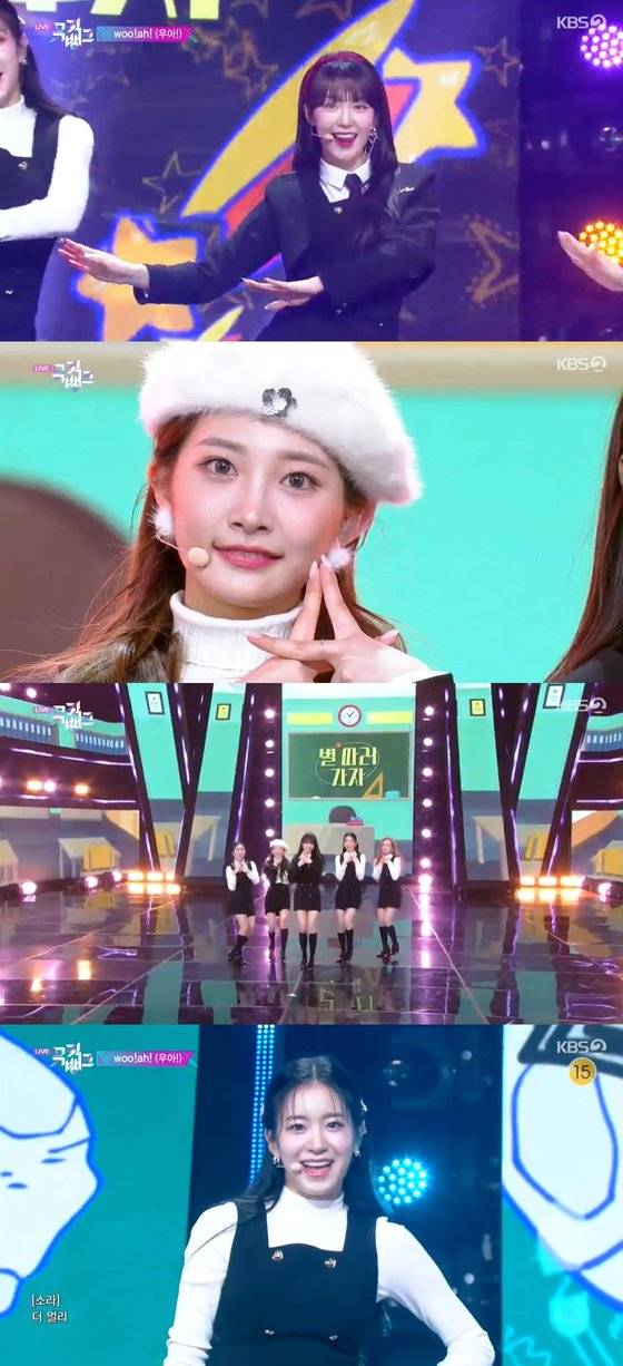 우아는는 14일 오후 5시 방송한 KBS 2TV '뮤직뱅크'에서 디지털 싱글 '별 따러 가자' 무대를 공개했다.