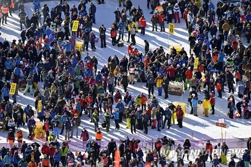 epa09684758 Spectators gather prior to the men's Downhill race of the FIS Alpine Skiing World Cup on the Lauberhorn in Wengen, Switzerland, 14 January 2022. EPA/JEAN-CHRISTOPHE BOTT