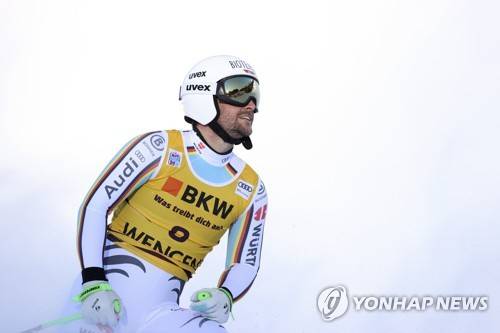 Germany's Dominik Schwaiger checks his time at the finish area of an alpine ski, men's World Cup downhill race, in Wengen, Switzerland, Friday, Jan. 14, 2022. (AP Photo/Luciano Bisi)
