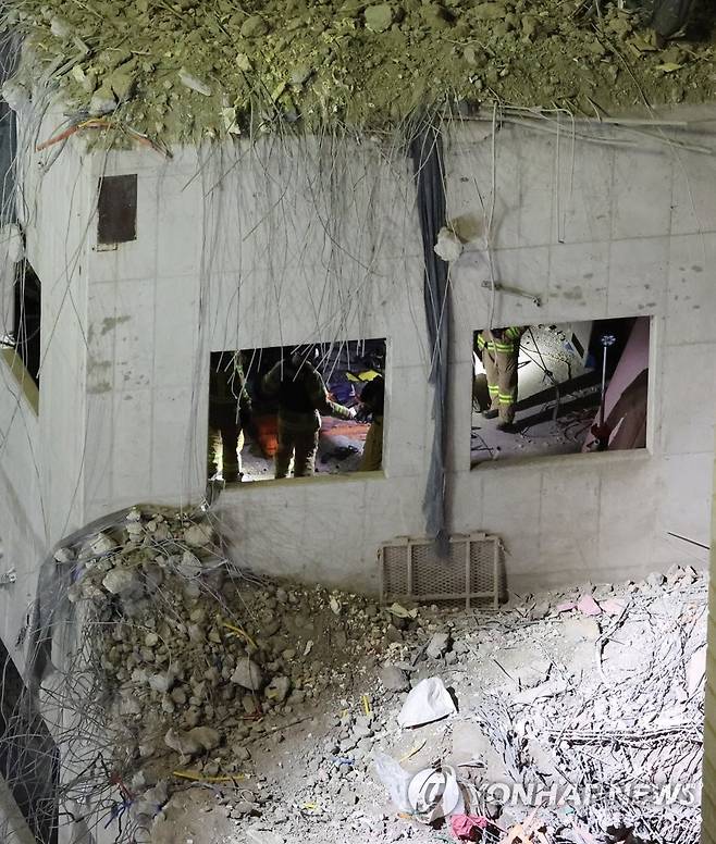 (광주=연합뉴스) 김도훈 기자 = 광주 서구 화정동 신축아파트 붕괴사고 나흘째인 14일 구조대원들이 수색작업을 마치고 철수하기 전 현장을 살피고 있다.