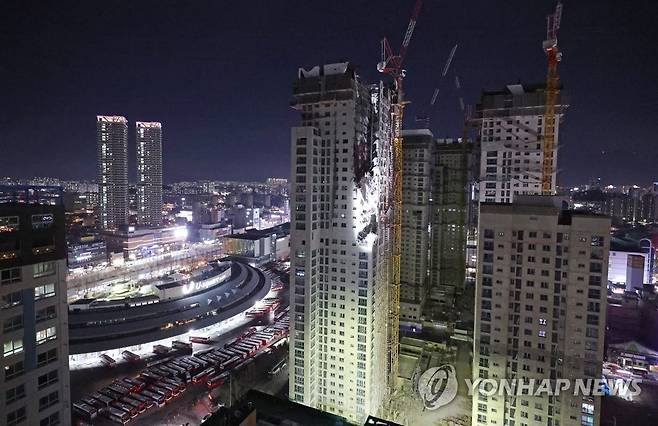 (광주=연합뉴스) 김도훈 기자 = 광주 서구 화정동 신축아파트 붕괴사고 나흘째인 14일 밤 사고 발생 부분에 조명이 비치고 있다. 2022.1.14