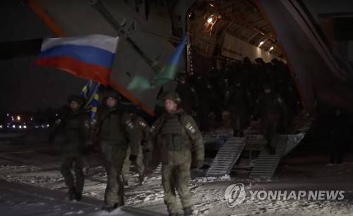 epa09684928 A handout still image taken from handout video made available by the Russian Defence Ministry press service shows Russian peacekeepers attending a welcome ceremony when they returned after finishing the mission in Kazakhstan on the military base in Ivanovo, Russia, 14 January 2022. The withdrawal of the CSTO peacekeeping contingent from Kazakhstan began on January 13 and will be completed within ten days. In accordance with the decision of the CSTO Collective Security Council adopted on 06 January 2022, the collective peacekeeping forces of the Collective Security Treaty Organization (CSTO) have been sent 'for a limited time to stabilise and normalise the situation to Kazakhstan' at the request of the Kazakh president. They include units of the Armed Forces of Russia, Belarus, Armenia, Tajikistan and Kyrgyzstan. The Russian Ministry of Defence announced on 08 January that the transfer of the Russian contingent of the CSTO peacekeeping forces to Kazakhstan's 'Almaty' and 'Zhitygen' airfields continued by military transport aircraft from Russia's airfields in the Moscow, Ivanovo, and Ulyanovsk regions. EPA/RUSSIAN DEFENCE MINISTRY PRESS SERVICE/HANDOUT HANDOUT EDITORIAL USE ONLY/NO SALES