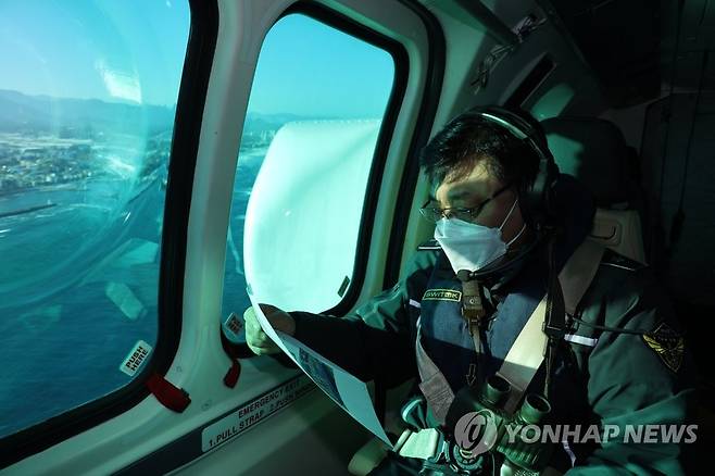 (동해=연합뉴스) 강성기 동해지방해양경찰청장이 14일 강원도 내 연안해역 해상치안 상황점검을 위해 항공순찰을 하고 있다.