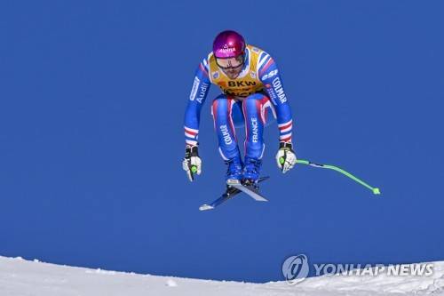 epa09685011 Nils Allegre of France in action during the men's Downhill race of the FIS Alpine Skiing World Cup on the Lauberhorn in Wengen, Switzerland, 14 January 2022. EPA/JEAN-CHRISTOPHE BOTT
