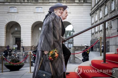 Queen Margrethe is welcomed by the the Speaker of the Parliament Henrik Dam Kristensen at the Danish Parliament's celebration of the Queen Margrethe 50th Regent's Anniversary at Christiansborg Castle, Copenhagen, Friday Jan. 14, 2022. Denmark’s popular monarch Queen Margrethe is marking 50 years on the throne with low-key events. The public celebrations for Friday's anniversary have been delayed until September due to the pandemic. (Mads Claus Rasmussen/Ritzau Scanpix via AP) DENMARK OUT