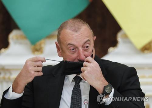 epa09685078 Azerbaijan President Ilham Aliyev puts on a protective mask during a joint briefing with the Ukrainian President following their talks at the Mariinsky Palace in Kiev, Ukraine, 14 January 2022. Azerbaijan President Ilham Aliyev arrived in Ukraine for a working visit to meet with top officials. EPA/SERGEY DOLZHENKO