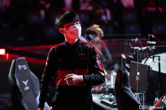 14일 오후 서울 종로구 그랑서울 내 롤파크 LCK 아레나에서 열린 2022 LCK 스프링 1라운드 프레딧 브리온과 T1과의 2세트서 승리한 '페이커' 이상혁이 무대 뒤로 들어가고 있다.