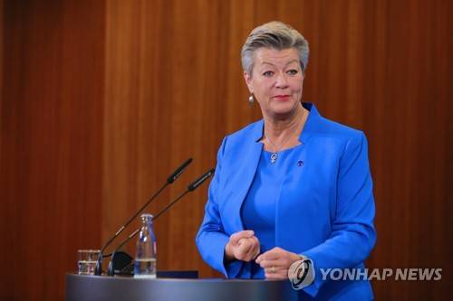 epa09685120 Swedish EU Home Affairs Commissioner Ylva Johansson speaks during a joint media conference with Germany's Federal Minister of the Interior, Nancy Faeser (not in picture), following their meeting at the German Interior Ministry, in Berlin, Germany, 14 January 2022. EPA/Christian Marquardt / POOL