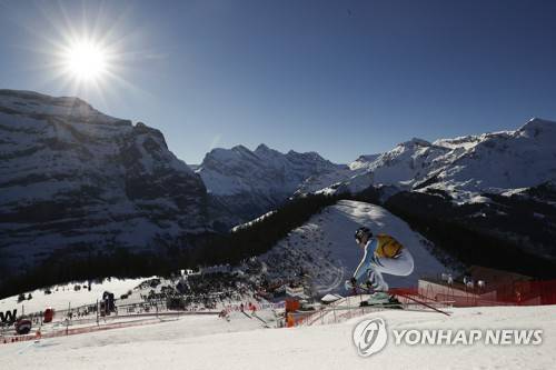 Germany's Simon Jocher speeds down the course during an alpine ski, men's World Cup downhill race, in Wengen, Switzerland, Friday, Jan. 14, 2022. (AP Photo/Gabriele Facciotti)
