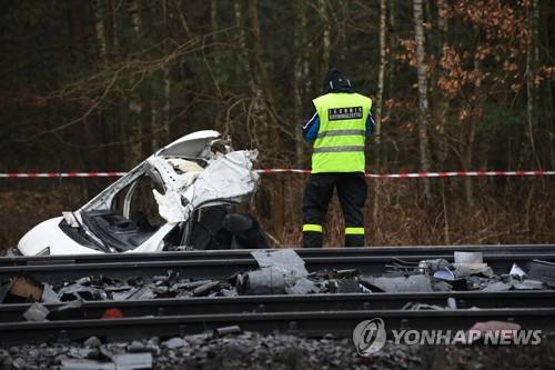 epa09685182 Aftermath of an accident that occurred when a railbus and a car collided in Widelka village, south-eastern Poland, 14 January 2022. The driver of a car was reportedly killed in the accident. EPA/Darek Delmanowicz POLAND OUT
