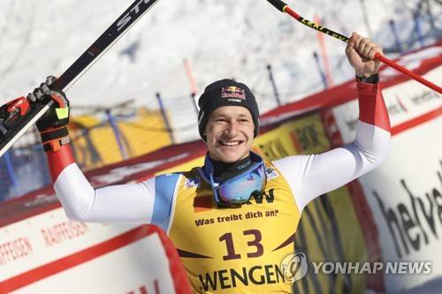 Switzerland's Marco Odermatt celebrates taking second place in an alpine ski, men's World Cup downhill race, in Wengen, Switzerland, Friday, Jan. 14, 2022. (AP Photo/Luciano Bisi)