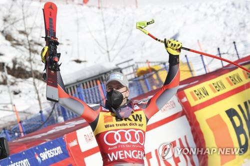 Norway's Aleksander Aamodt Kilde celebrates winning an alpine ski, men's World Cup downhill race, in Wengen, Switzerland, Friday, Jan. 14, 2022. (AP Photo/Luciano Bisi)