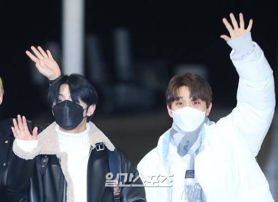 그룹 골든차일드의 주찬, Y가 14일 밤 두바이에서 열리는 두바이엑스포 한국관 한국의 날 케이팝 콘서트에 참석차 인천국제공항 1터미널을 통해 두바이로 출국하고 있다.