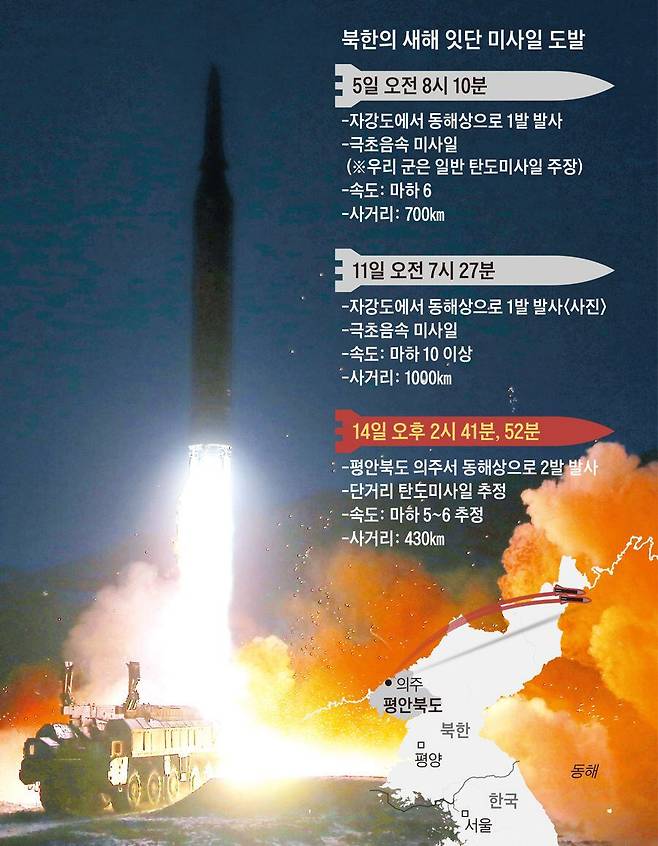 14일 북한의 미사일 도발은 미국의 독자 대북 제재 발표 하루 만에 이뤄졌다. 북한은 이날 오전 외무성을 통해 “강력히 반응하겠다”고 위협했고, 8시간 후 탄도미사일 2발을 발사했다. 작년 10월 중순 잠수함발사탄도미사일(SLBM) 시험 발사 이후 3개월간 도발을 잠시 멈췄던 북한이 새해 첫 2주 동안에만 미사일을 3연속 발사하며 한반도 주변의 군사적 긴장을 빠르게 끌어올리는 모습이다. 미 국무부 대변인은 이날 “미국은 북한의 탄도미사일 발사를 규탄한다”며 “미사일 발사는 복수의 유엔 안보리 결의 위반이며 이웃 및 국제사회에 대한 위협”이라고 했다. 미 인도태평양 사령부도 “미사일 발사는 북한의 불법 무기 프로그램이 안보 불안에 미치는 영향을 여실히 보여준다”고 했다.