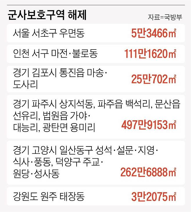 당정은 지난해에도 인천과 경기 김포·파주·고양·양주 등에서 1144만여㎡를 제한보호구역에서 해제했다. 박완주 더불어민주당 정책위의장은 “당정은 군사시설 보호구역으로 아직도 지역 주민과 지방 정부가 많은 불편과 피해를 겪는다는 데 인식을 같이했다”며 “군사작전상 제한이 없는 곳을 보호구역에서 해제하기로 했다”고 했다.