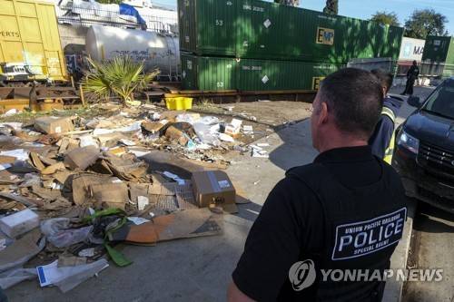 A police officer watches looks shredded boxes and packages at a section of the Union Pacific train tracks in downtown Los Angeles Friday, Jan. 14, 2022. Thieves have been raiding cargo containers aboard trains nearing downtown Los Angeles for months, leaving the tracks blanketed with discarded packages. The sea of debris left behind included items that the thieves apparently didn't think were valuable enough to take, CBSLA reported Thursday. (AP Photo/Ringo H.W. Chiu)