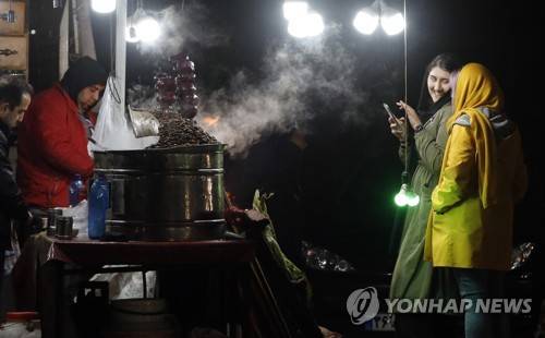 epa09685771 Women wait to buy boiled beetroot and beans at a street food stall in Fasham road, outside Tehran, Iran, 14 January 2022. EPA/ABEDIN TAHERKENAREH