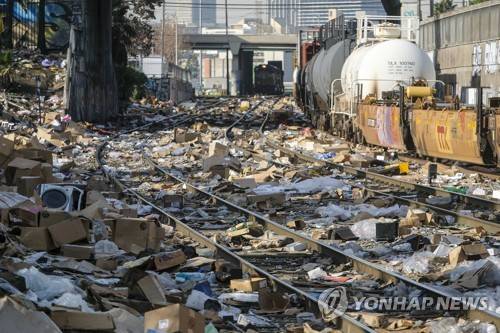 Shredded boxes and packages are seen at a section of the Union Pacific train tracks in downtown Los Angeles Friday, Jan. 14, 2022. Thieves have been raiding cargo containers aboard trains nearing downtown Los Angeles for months, leaving the tracks blanketed with discarded packages. The sea of debris left behind included items that the thieves apparently didn't think were valuable enough to take, CBSLA reported Thursday. (AP Photo/Ringo H.W. Chiu)