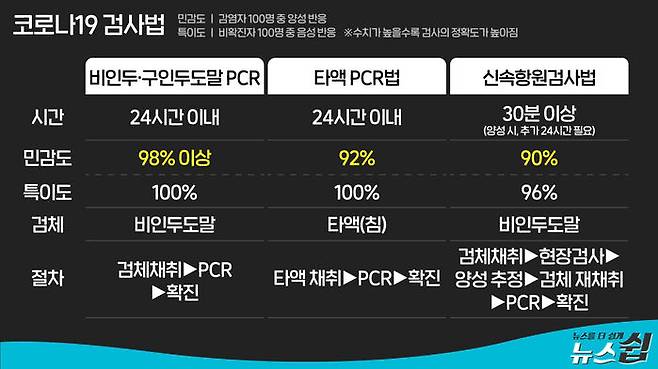 질병청에 따르면 콧속 깊숙이 면봉을 넣어 검체를 채취하는 비인두도말 PCR검사는 민감도(양성을 양성으로 판단하는 확률) 98% 이상, 특이도(음성을 음성으로 판단할 확률)가 100% 수준이다. 타액 PCR 검사는 특이도는 100%지만, 민감도가 92%로 비인두도말 PCR에 미치지 못하는 것으로 나타났다. 비인두도말 방식의 신속항원검사는 민감도가 90%, 특이도가 96% 수준이다. 다만 신속항원검사의 경우 비인두도말이 아닌 비강 혹은 타액 방식 등 검사 방식에 따라 민감도는 더 내려갈 수 있다. 자가진단키트는 제조업체마다 다른데, 업체가 공개한 민감도보다 실제로 더 낮게 나타난 사례도 있었다. 대한의학지에 실린 서울대병원 연구팀 결과에서는 국내 한 업체의 진단 키트 민감도가 17.5%에 불과했다는 내용이 실리기도 했다.