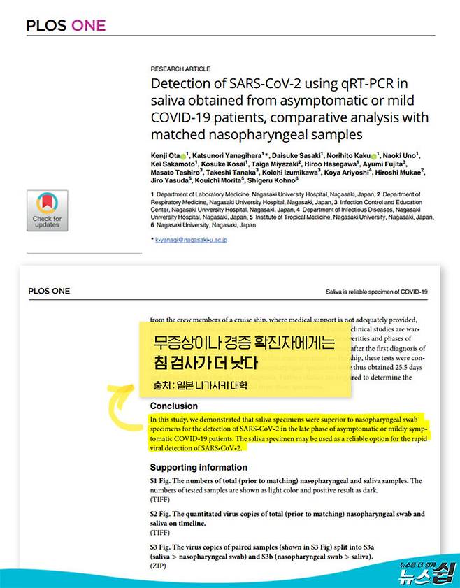 최근에는 정확도가 떨어질 줄 알았던 침으로 하는 검사가 오히려 나을 수 있다는 연구 결과도 속속 나오고 있다. 일본 나가사키대학교 연구팀은 무증상이나 경증 확진자에게는 타액 검사가 더 낫다는 연구 결과를 발표했다. 아래 두 개의 논문은 SBS 조동찬 의학전문 기자가 1월 8일 8뉴스에서 언급한 내용이다.