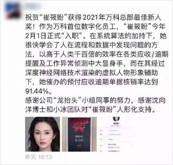 중국 최대 부동산개발업체 '완커그룹'이 올해의 최우수 신입 사원으로 '가상 인간(Virtual Human)'을 선정했습니다.