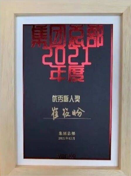 완커그룹 이사회 의장 위량은 최근 SNS에 한 여성의 사진을 올리며 "2021 완커 본사 최우수 신인상을 받은 추이샤오판을 축하합니다. 그녀의 선불 미수금, 연체 문서 확인율은 91.44%에 달했습니다"라는 글을 남겼습니다.