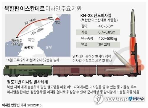(서울=연합뉴스) 반종빈 기자 = 북한이 철로 위 열차에서 '북한판 이스칸데르'(KN-23) 단거리 탄도미사일 2발을 발사한 것이 확인됐다.