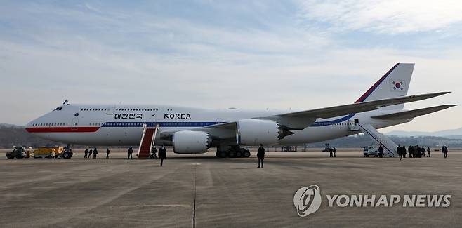 (성남=연합뉴스) 서명곤 기자 = 문재인 대통령의 새해 중동 3개국 순방에 투입되는 신형 공군 1호기가 15일 성남 서울공항에서 출발 준비를 하고 있다.