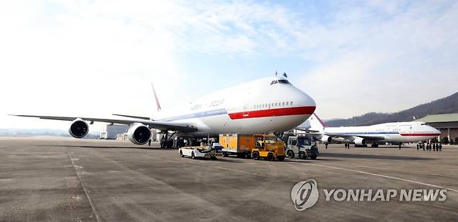 (성남=연합뉴스) 서명곤 기자 = 문재인 대통령의 새해 중동 3개국 순방에 투입되는 신형 공군 1호기(왼쪽)가 15일 성남 서울공항에서 출발 준비를 하고 있다.