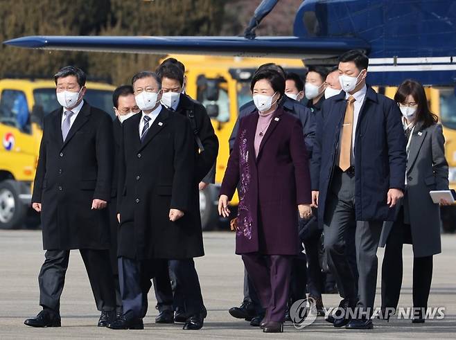 (성남=연합뉴스) 서명곤 기자 = 문재인 대통령과 김정숙 여사가 6박 8일간의 일정으로 아랍에미리트연합(UAE), 사우디아라비아, 이집트 등 중동 3개국을 방문하기 위해 15일 오전 성남 서울공항에 도착, 공군 1호기로 이동하고 있다. 2022.1.15 seephoto@yna.co.kr