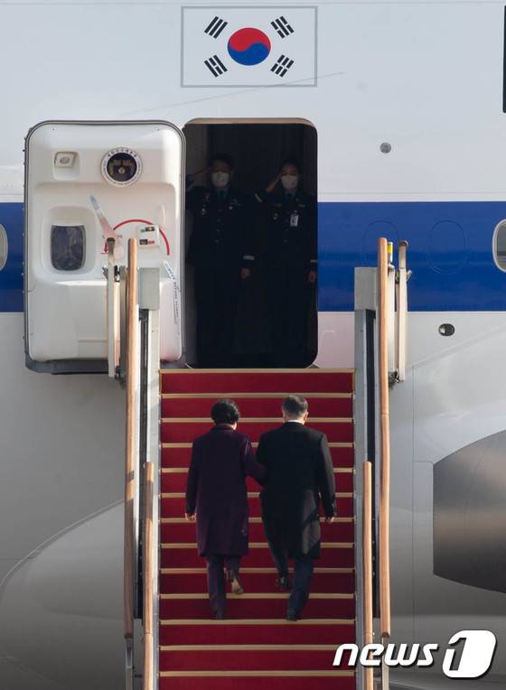 (성남=뉴스1) 성동훈 기자 = 문재인 대통령과 김정숙 여사가 15일 경기 성남시 서울공항에서 아랍에미리트연합(UAE), 사우디아라비아, 이집트 등 중동 3개국 순방을 위해 공군 1호기에 탑승하고 있다. 2022.1.15/뉴스1