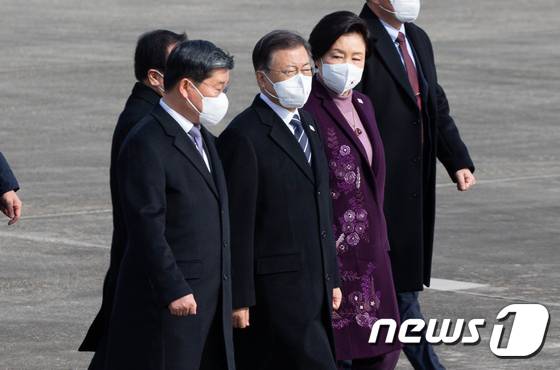 (성남=뉴스1) 성동훈 기자 = 문재인 대통령과 김정숙 여사가 15일 경기 성남시 서울공항에서 아랍에미리트연합(UAE), 사우디아라비아, 이집트 등 중동 3개국 순방을 위해 공군 1호기로 이동하며 환송 나온 전해철 행정안전부 장관과 대화하고 있다. 2022.1.15/뉴스1