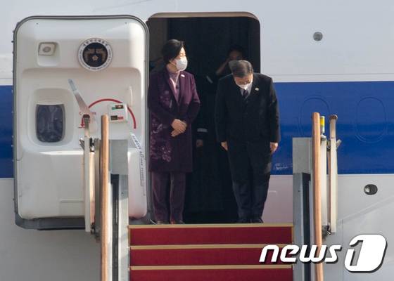 (성남=뉴스1) 성동훈 기자 = 문재인 대통령과 김정숙 여사가 15일 경기 성남시 서울공항에서 아랍에미리트연합(UAE), 사우디아라비아, 이집트 등 중동 3개국 순방을 위해 공군 1호기에 올라 인사하고 있다. 2022.1.15/뉴스1