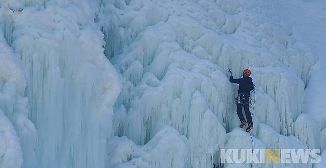 최근 강추위가 이어지며 인공폭포가 꽁꽁 얼어붙어 빙벽타기를 즐기려는 사람들로 인기를 끌고 있다.