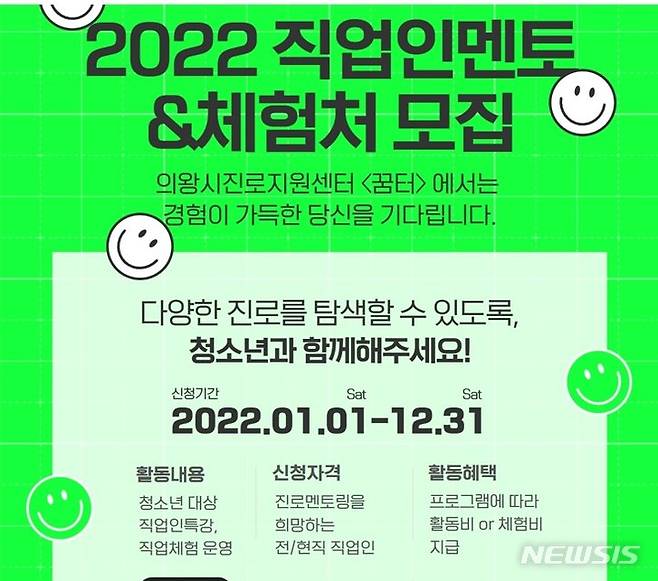 경기 의왕시 청소년 육성 재단의 의왕시 진로지원센터 '꿈터'는 관내 청소년들에게 진로 정보 등을 안내하고 지원할 수 있는 '직업인 멘토'와 '직업 체험처'를 모집한다.
