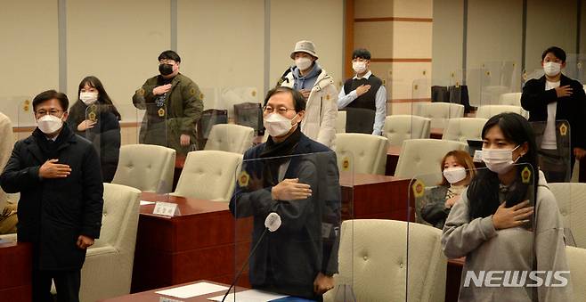 [전주=뉴시스] 김얼 기자 = 김성주 더불어민주당 전북도당 도당위원장을 비롯한 관계자들이 15일 전북 전주시 전북도의회 의총회의실에서 열린 '첫 선거단 정책토론회'에 참석해 국민의례를 하고 있다. 2022.01.15. pmkeul@nwsis.com